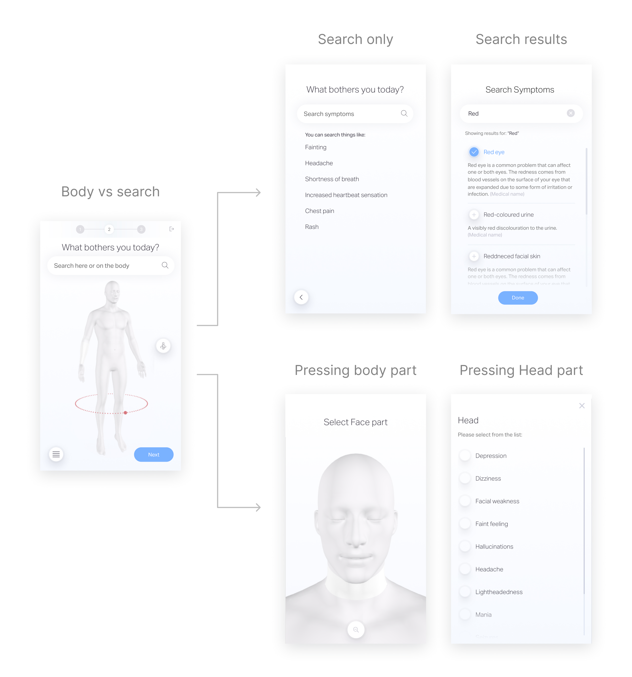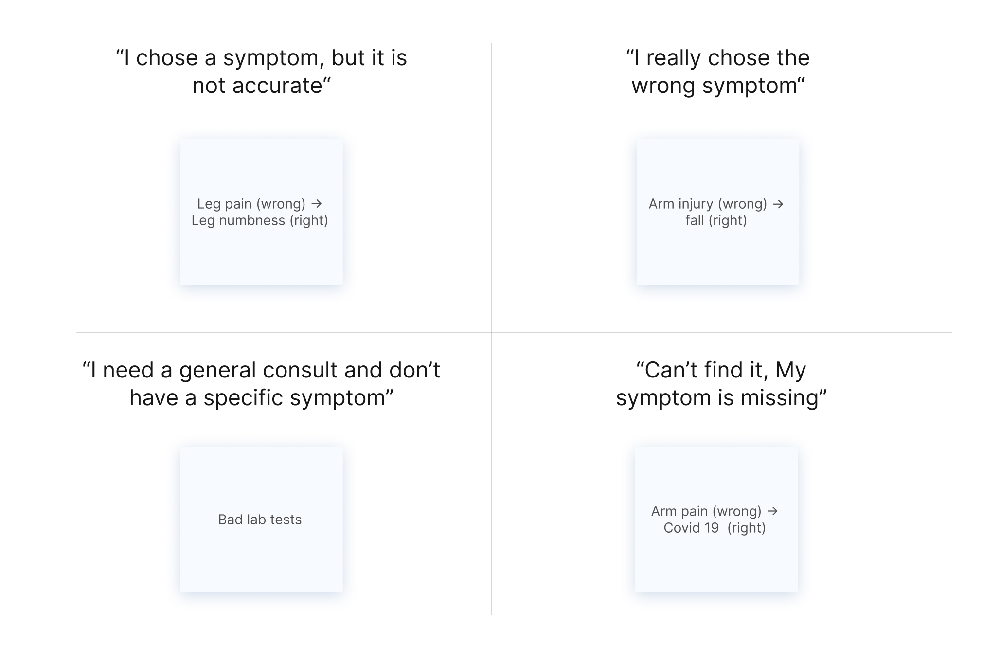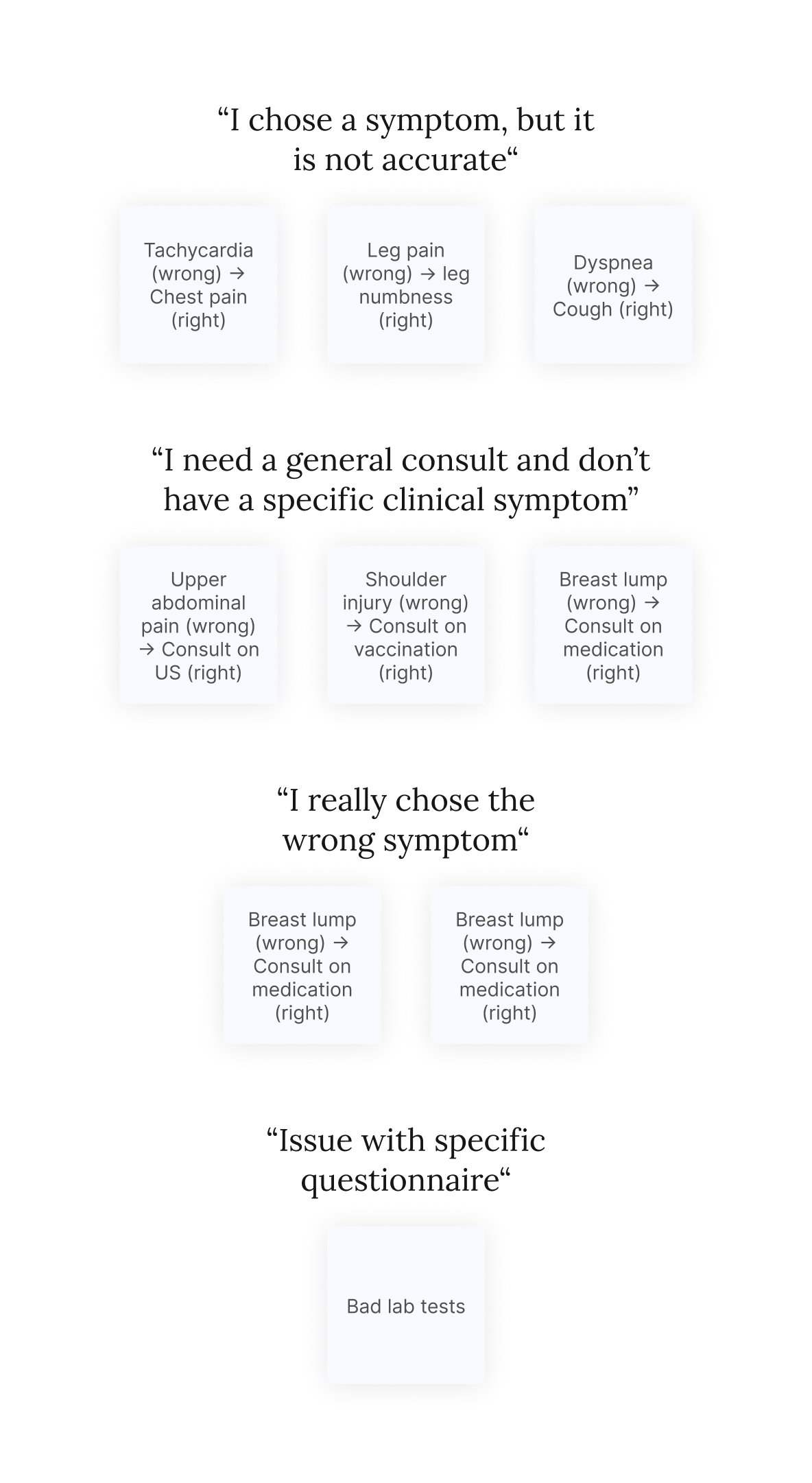 After the research, I came up with a list of reasons why users choose incorrect and inaccurate symptoms; based on these assumptions, I began to ideate new UX solutions for the symptom selection phase