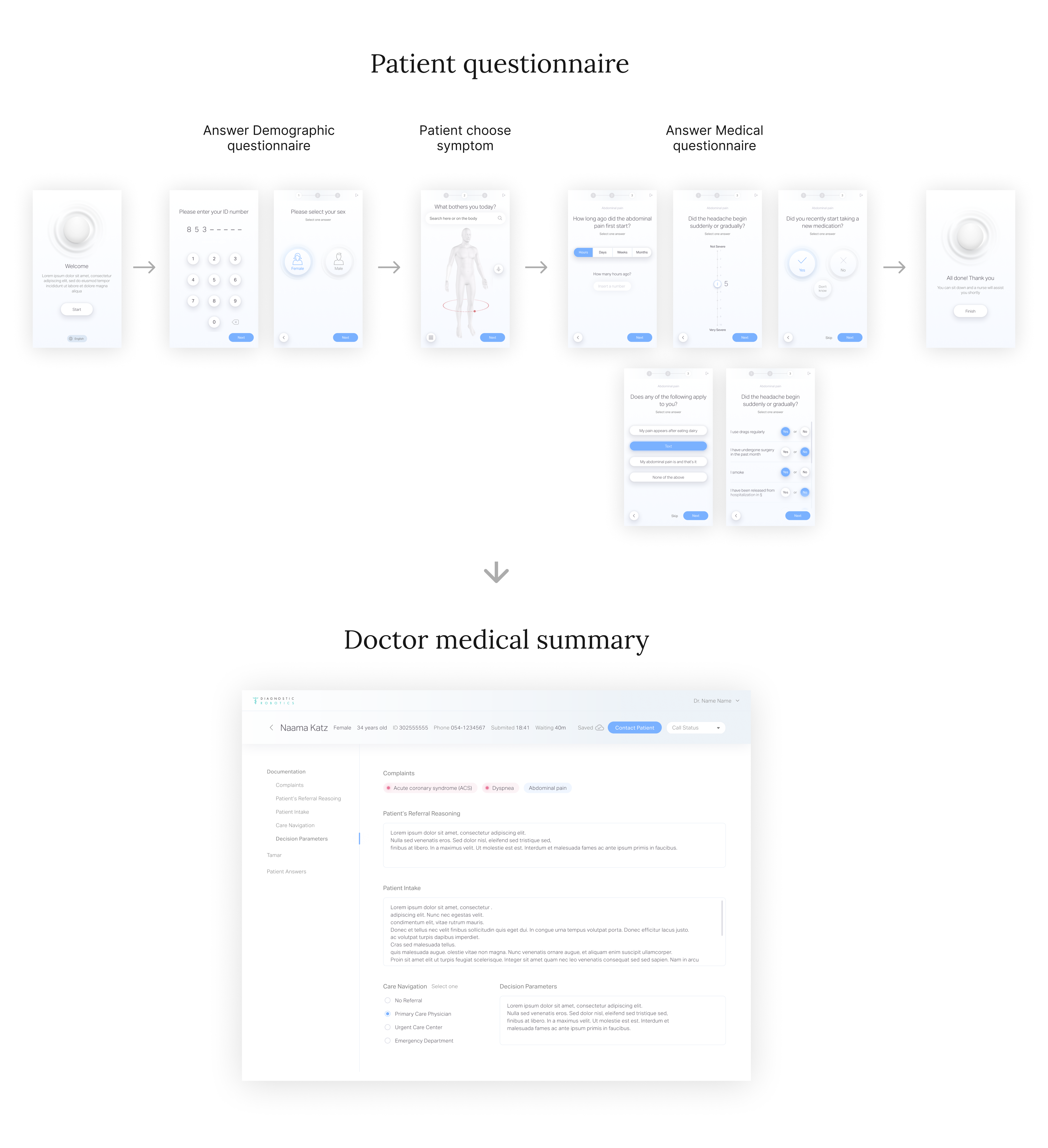 The patient answer demographic questions, choose a symptom that he suffer from and answer medical questionnaire created by a medical team, then his answers goes through ML process and served to the MD as a medical summary.