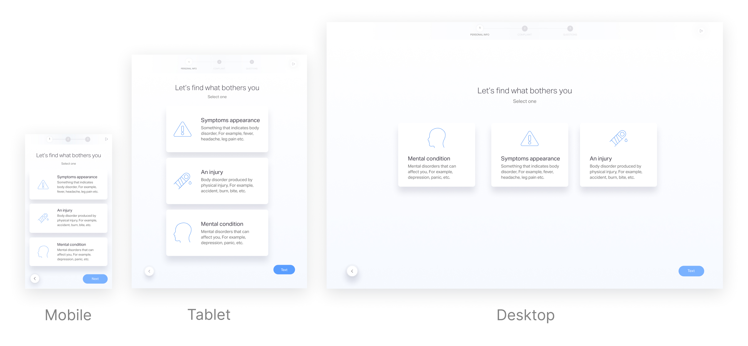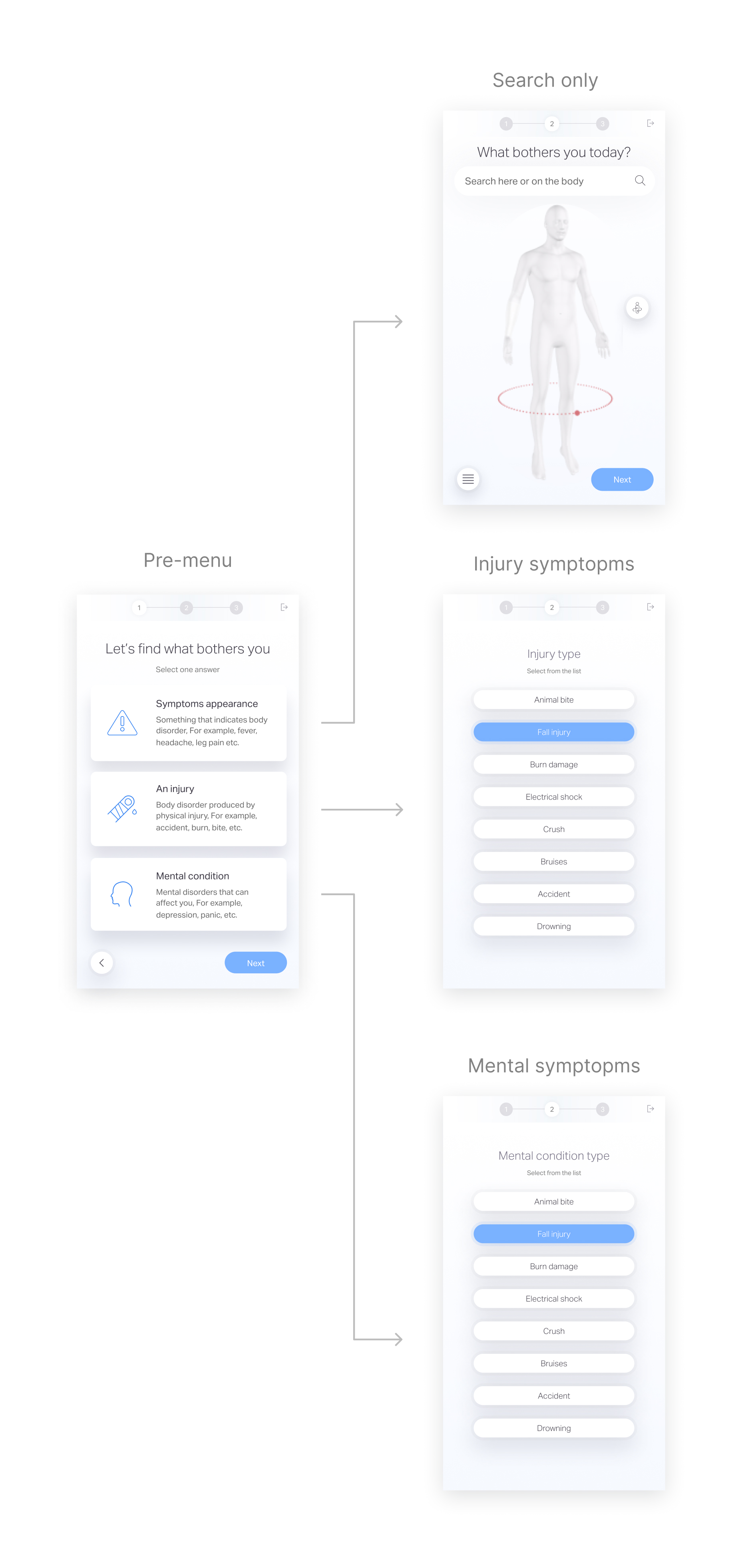 Explanation: I presented the user with a three-option screen, where “injuries” and “mental condition” led to single-answer screens and “symptoms’ appearance” led to current flow.