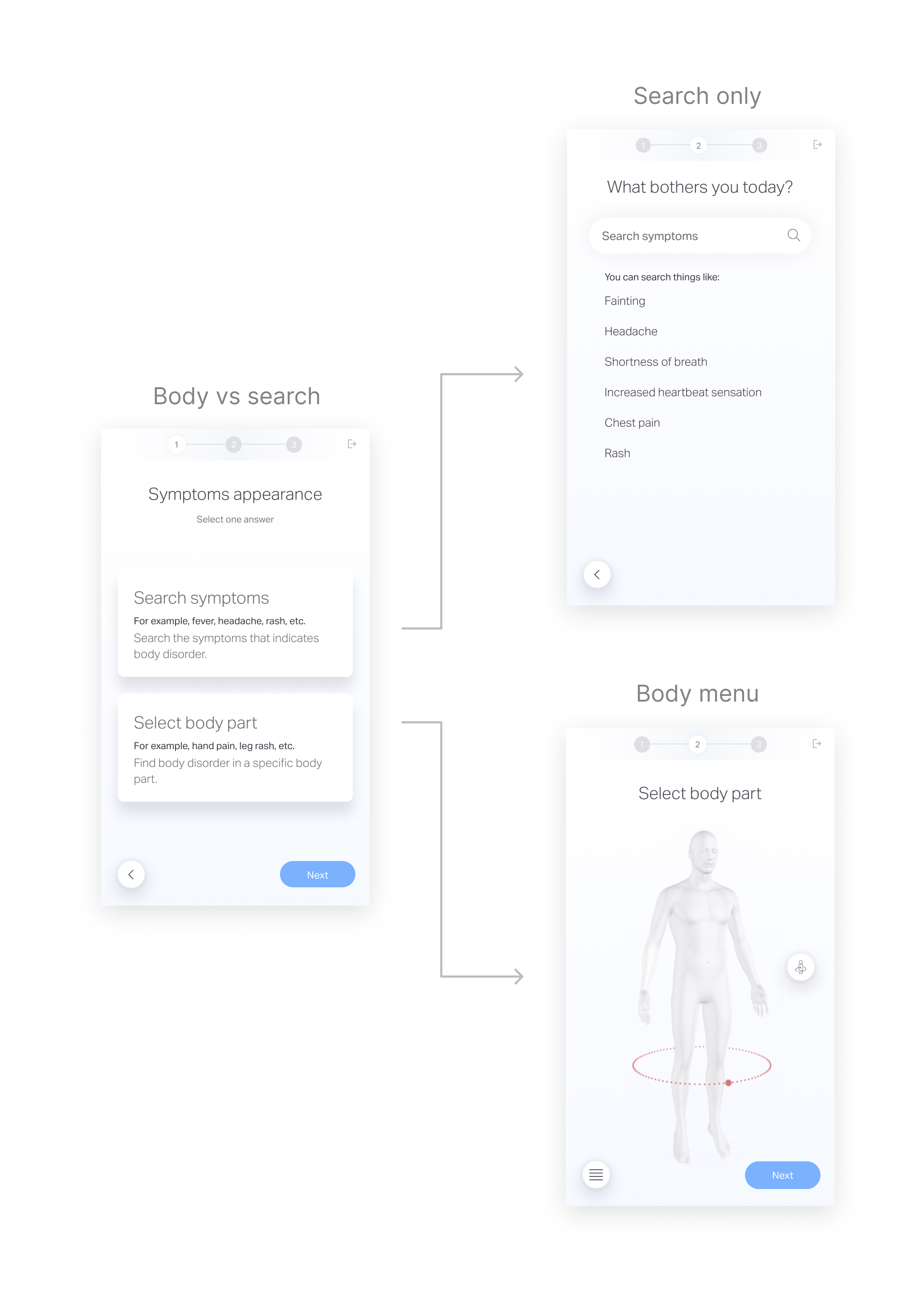 Value: Understand if separating the body figure and search function to different screens with explanations and examples before seeing them, helps the user select the correct mechanism for their issue.