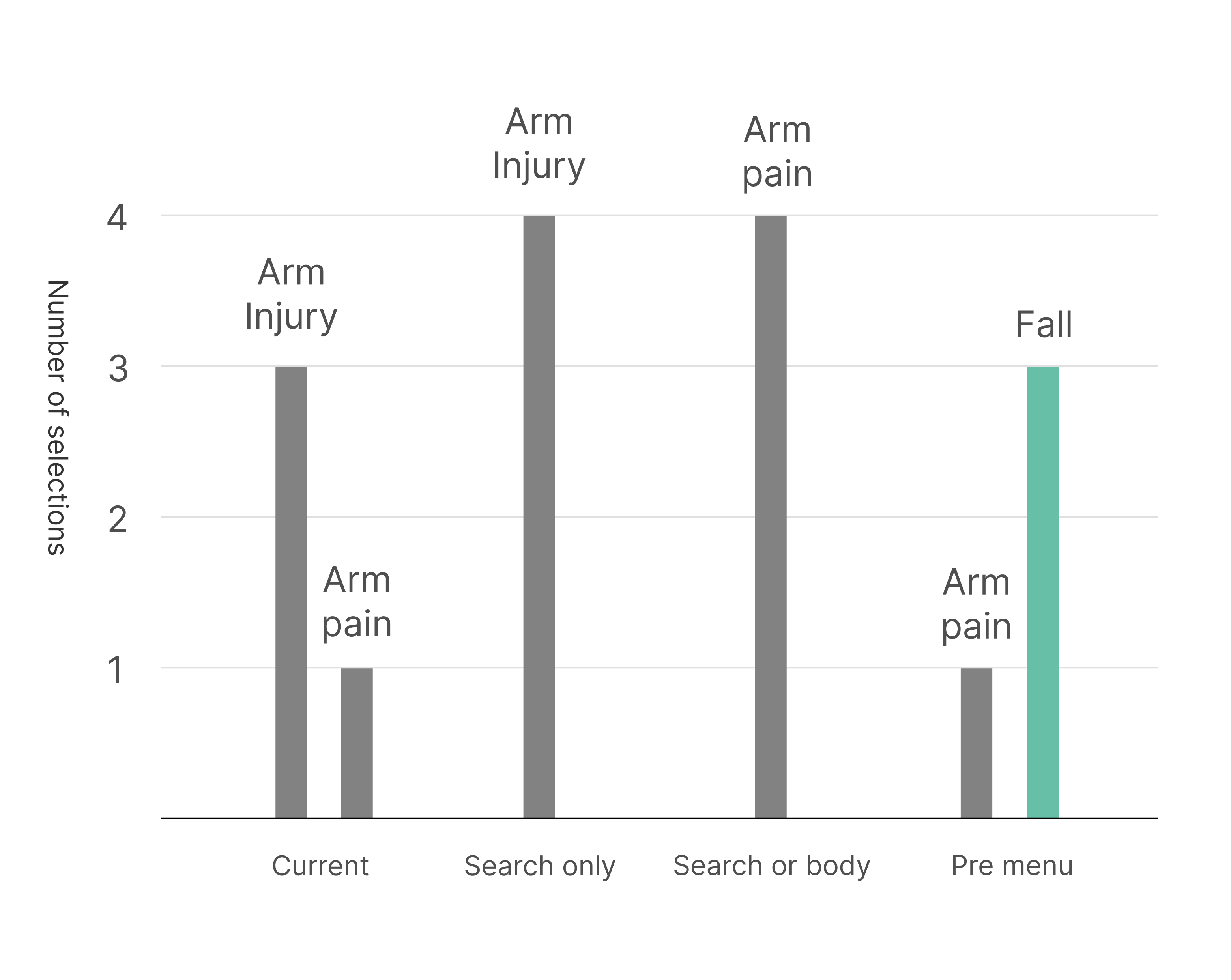 When presenting users with the case: "While cleaning, you fell from the top of a ladder, and you now have severe pain in your right arm" with the different flows, the results were clear: adding the "injury" pre-menu (Design 4) led to selection of the "Fall" symptom, compared to the rest of the designs where users searched for "arm pain" and "arm injury" symptoms.
